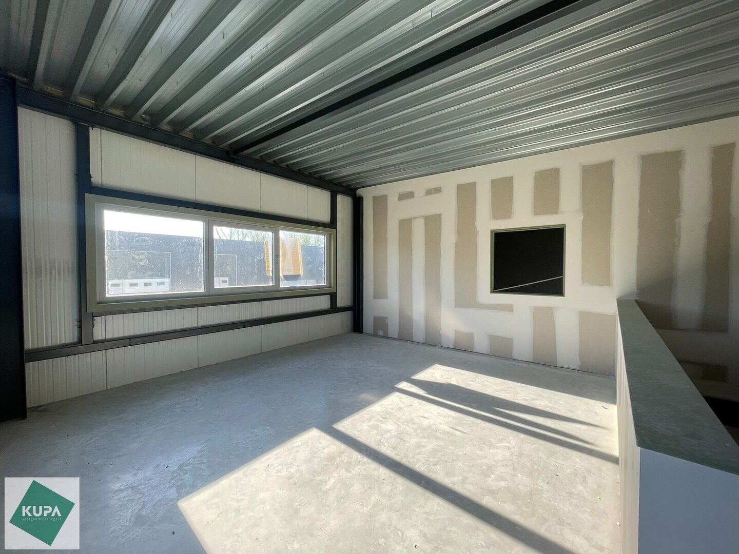 Zeer goed gelegen magazijn te huur (KMO unit) van 288m² met mezzanine van 140m² en 2 parkings, gelegen op een uitstekende locatie te Lede. Het magazijn kan gebruikt worden als opslagruimte en/of atelierruimte. De geïsoleerd loods is opgebouwd uit een staalstructuur met betonpanelen, de voorgevel is voorzien in een betonnen plint van 2m hoogte en daarboven geïsoleerde sandwichpanelen. Verder is elke unit voorzien van dak in steeldeck, 1 sectionale poort (4m x 4,5m) met 1 toegangsdeuren, gepolierde betonvloer en lichtstraten . De vrije hoogte bedraagt circa 7m.