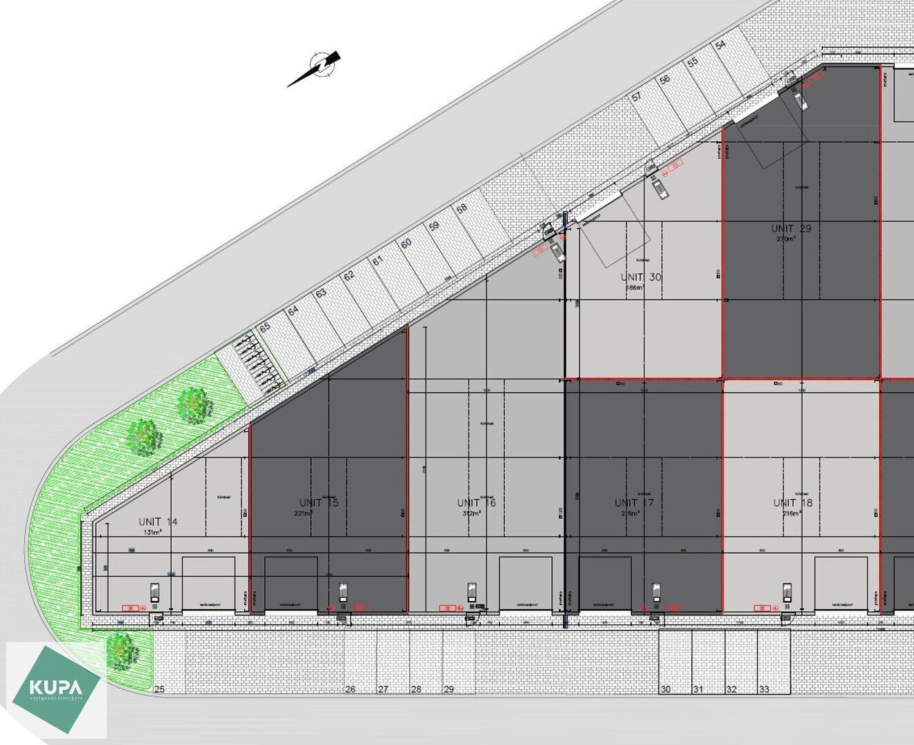 De casco magazijnen hebben een vrije hoogte van 6 meter en zijn gebouwd met een solide staalstructuur, betonnen wanden (3 m hoog) en geïsoleerde sandwichpanelen. Elke unit is toegankelijk via een automatische sectionale poort (4 m breed x 4 m hoog) met aparte toegangsdeur. Daarnaast zijn de magazijnen uitgerust met een duurzame polybetonvloer, een lichtstraat met rookluik, branddetectie en individuele aansluitingen voor water, elektriciteit (32 A) en data.