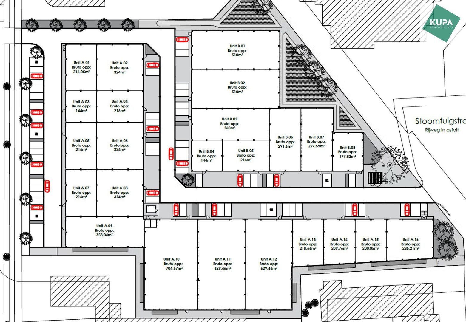 Het nieuwe bedrijvencentrum Steenpoort is strategisch gelegen in Hooglede (West-Vlaanderen), met een uitstekende zichtlocatie langs de N32 en vlotte verbinding naar de R32, in de bedrijvenzone “Stoomtuig Gits”. Het project omvat 24 kwalitatieve KMO-units met oppervlaktes van 324 m² tot 705 m², geschikt voor productie, opslag of combinatie met kantoor. Een bijkomende troef is de optimale bereikbaarheid: de site is toegankelijk via twee verschillende straten, waardoor u langs de ene zijde kan oprijden en langs de andere zijde opnieuw kan verlaten.